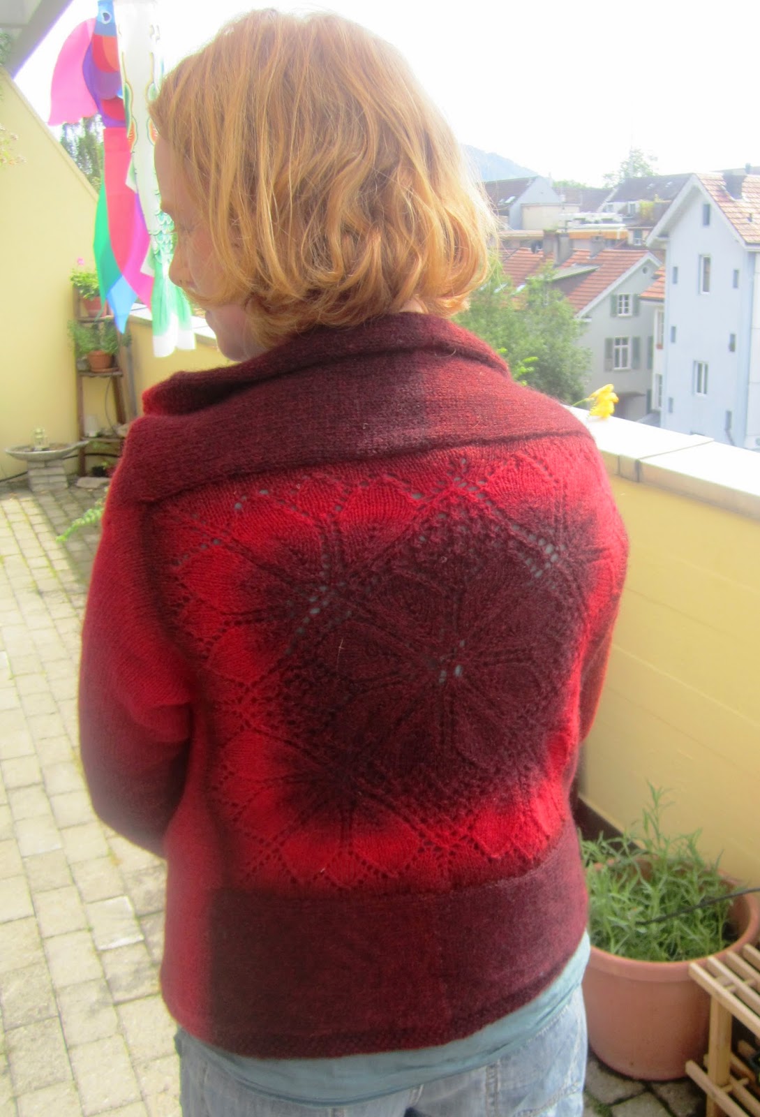 Here is my Dahlia cardigan.... it's not really the weather for it now, I haven't quite got into the right schedule for knitting - mind you, we're passed mid summer now, so the nights are drawing in (kind of, sort of):